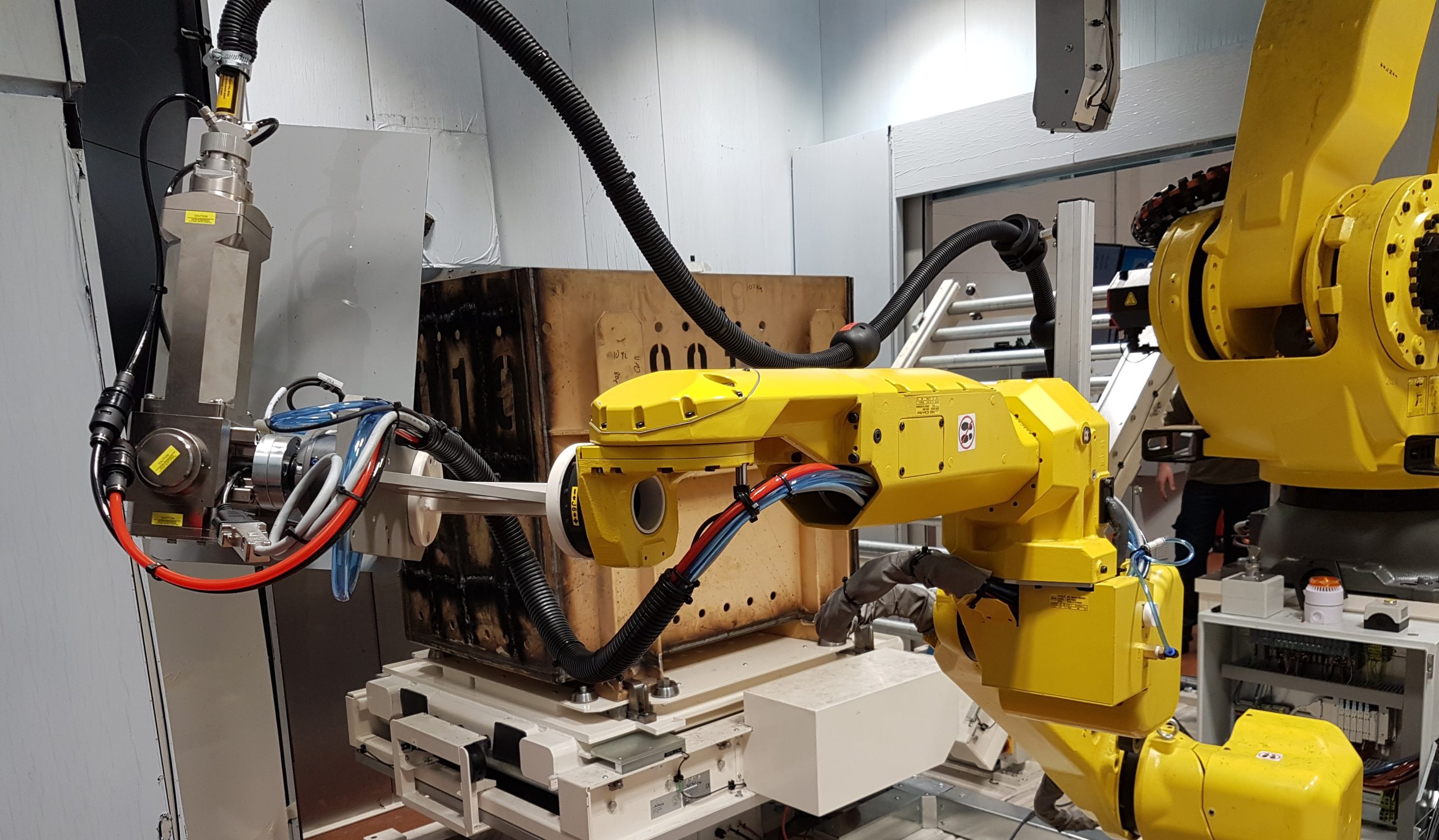 At the heart of the system are two six-axis FANUC robots: a compact ARC Mate 120iC for cutting, and a heavy duty M-900iB/360 equipped with two interchangeable end-effectors: a scanning head and an electromagnet for handling the panels. When in scanning mode, the M-900iB builds a 3D image of the skip within the machine’s control system. MeshLab software compares the scanned skip with a reference skip, enabling the control system to adjust the parameters of the ARC Mate 120iC robot (equipped with a laser cutting head) and determine the optimum cutting pattern.